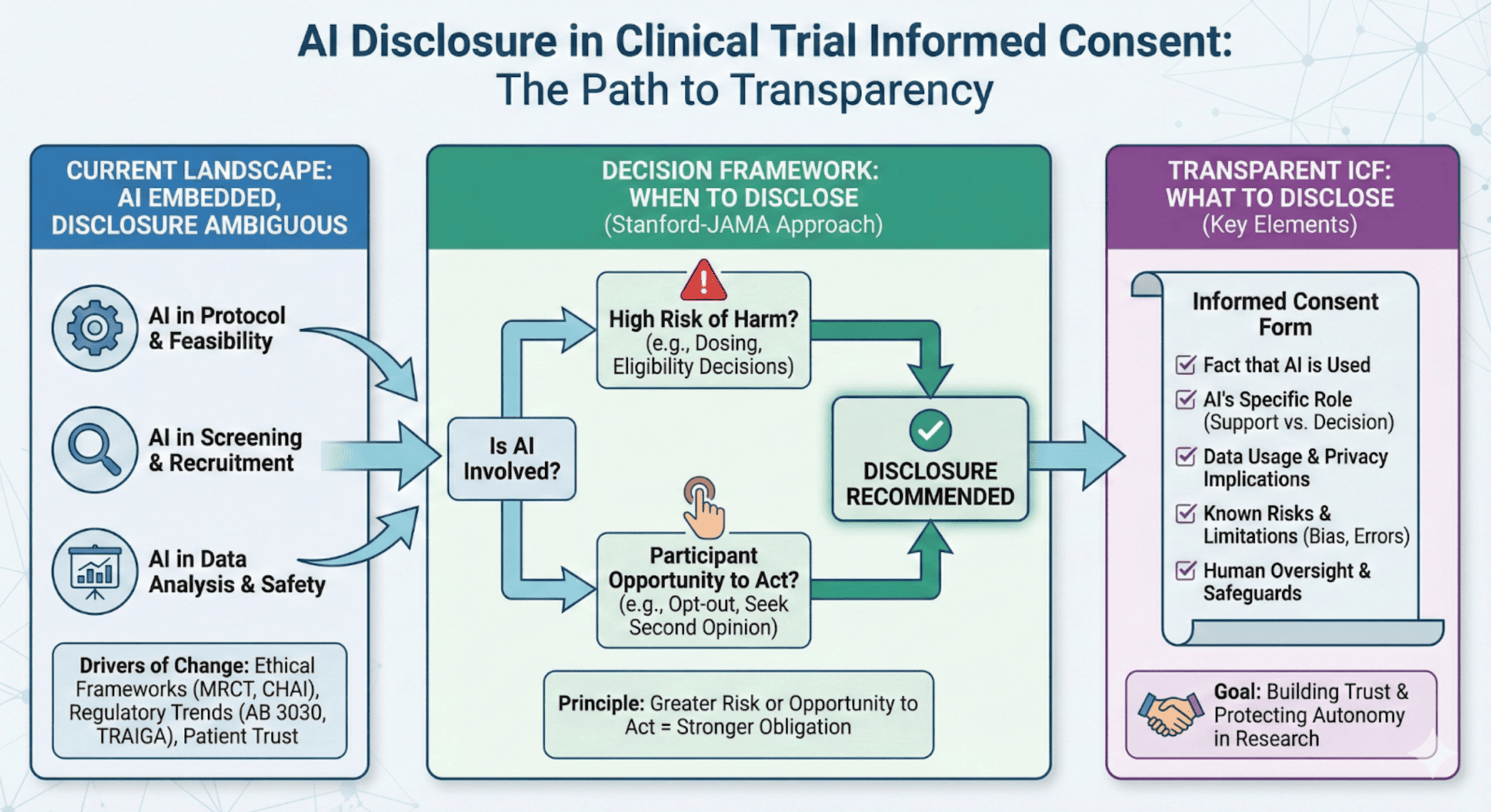 The clinical research community is at a pivotal moment. AI is already deeply embedded across the clinical trial ecosystem—from protocol optimization and site feasibility to patient recruitment and safety monitoring. Yet the guidance around when and how to disclose this use to participants has, until recently, remained frustratingly ambiguous. That’s now changing, and the direction is clear: transparency is emerging as both an ethical imperative and a practical best practice.
